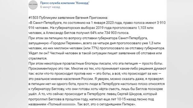 Сам же Беглов тогда сумел собрать 64% или 734 903 голоса. Пригожин отметил, что недавно созданную движением «Город перемен» петицию по вопросу отставки петербургского губернатора уже поддержали 77% или один миллион местных жителей. Всего в голосовании за четыре дня приняли участие 1,3 миллиона петербуржцев. «Уйдет ли он? Честный человек в такой ситуации пишет заявление об отставке или стреляется», — подчеркнул бизнесмен. Предприниматель добавил, что некоторые провластные блогеры успели написать о «причастности» ботов к результатам голосования за петицию. По словам Пригожина, многие из руководителей думают так: если события разворачиваются против них — это боты, а если им на пользу — реальное мнение граждан. «Я уверен, можно сказать даже, я проверял: в петиции нет ни одного бота, просто люди в Петербурге настолько плохо относятся к губернатору Беглову, что они готовы хоть черта съесть, лишь бы Беглов поскорее ушел», — заключил бизнесмен. Пригожин ранее сообщил, что Смольный пытается при помощи ботов переломить ситуацию с голосованием в петиции по вопросу отставки Беглова. Однако эти боты никак не могут повлиять на происходящее.