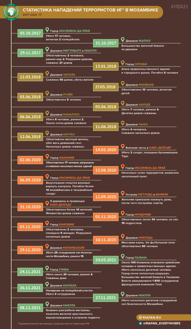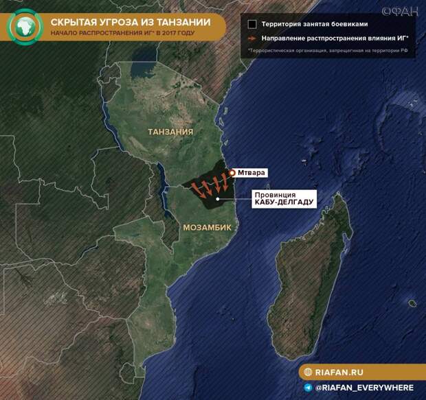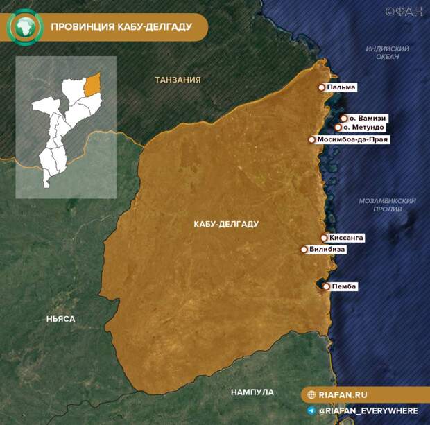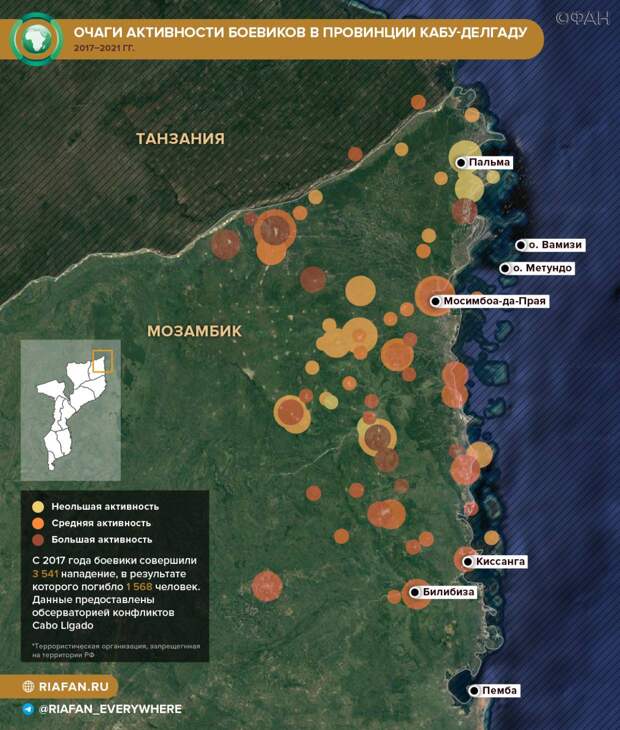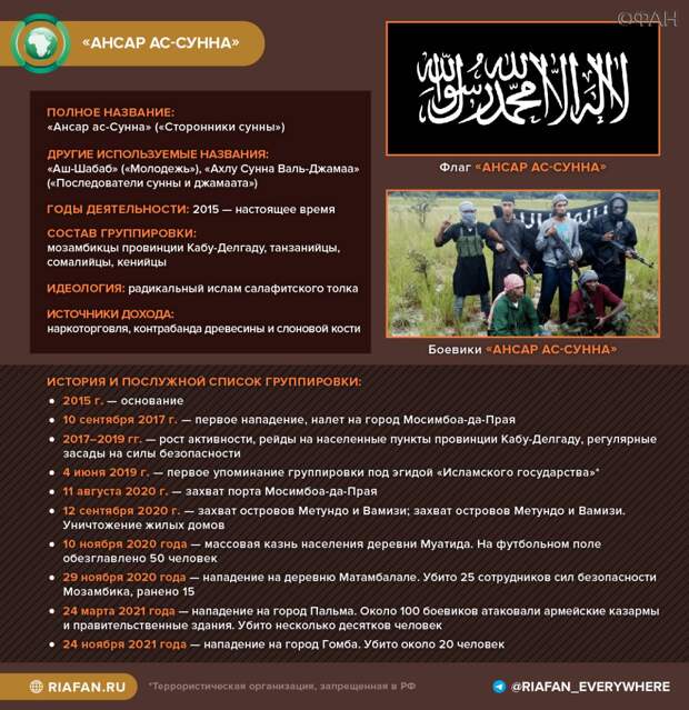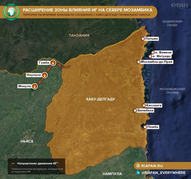 — Прим. ФАН). Руководитель военно-политического Telegram-канала Astra Militarum Комиссар Яррик объяснил, чем террористов привлек Черный континент:«Изначально Мозамбик был вторым фронтом ИГ, потому что основной интерес для боевиков представляли Сирия и Ирак. Мы с вами наблюдали это в течение гражданской войны в САР и во время иракской кампании. Проблемы начались после, когда в 2017 году боевиков разгромила сирийская правительственная армия, ВКС РФ и союзники. Как мы понимаем, тогда террористы лишились контроля над всей территорией ближневосточной страны».
