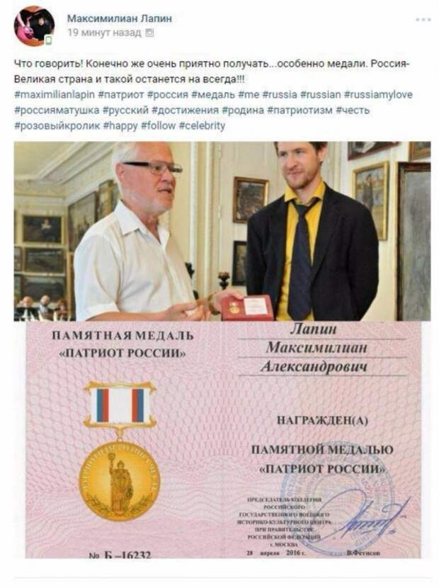 Россия-Великая страна и такой останется на всегда!!!», — написал бизнесмен, поделившись фото церемонии вручения памятного знака.Отметим, что пост он опубликовал с целым набором крайне разнообразных хэштегов: #maximilianlapin #патриот #россия #медаль #me #russia #russian #russiamylove #россияматушка #русский #достижения #родина #патриотизм #честь #розовыйкролик #happy #follow #celebrity.