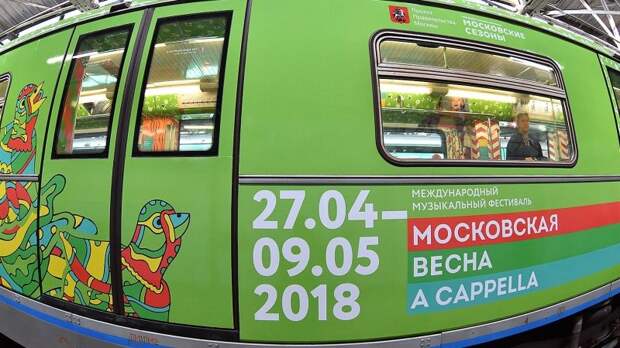 Поезд «Московская весна a cappella» можно увидеть по Кольцевой линии метро.«Это четвертый поезд, украшенный в тематике фестивалей «Московские сезоны», которые проходят в Москве в течении всего года. В 2018 их будет девять», — цитирует «Вечерняя Москва» руководителя московского департамента торговли и услуг Алексея Немерюка.