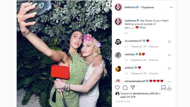 Поклонники считают, что ей пора прекратить походы к пластическим хирургам. По мнению фанатов, из-за пластики Мадонна стала не похожа на саму себя. Но звезда не обращает внимания на их упреки и продолжает молодиться.«Как частицы твоего сердца сопровождают тебя вокруг. Лола», — написала Мадонна.
