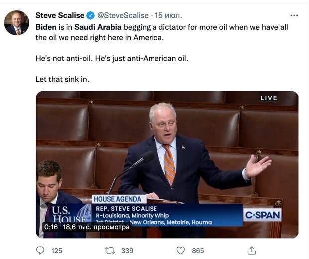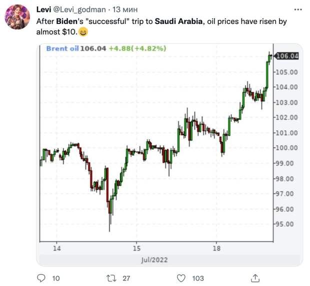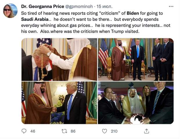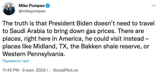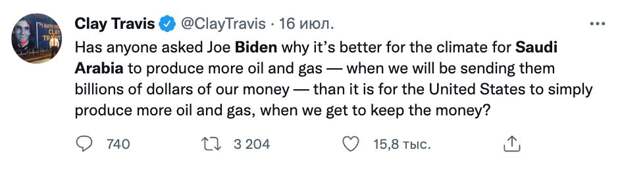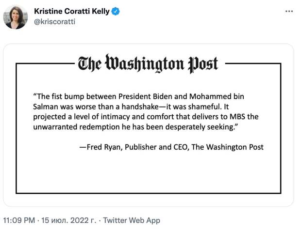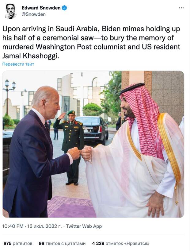 Я не думаю, что такое правительство должно вознаграждаться визитом президента США», — подчеркнул Сандерс. Байден, который в своей предвыборной кампании обещал сделать Саудовскую Аравию страной-изгоем, провел 15 июля переговоры с руководством страны в Джидде, на которых присутствовал кронпринц Мухаммад бин Салман Аль Сауд. Американская разведка утверждает, что принц лично одобрил убийство в 2018 году журналиста Джамиля Хашкади, известного своими критическими статьями о политике Эр-Рияда. Байден отметил, что он возложил на кронпринца вину за покушение на Хашкади, однако саудовское официальное лицо, присутствовавшее на мероприятии, заявило, что беседа проходила не так, как описал Байден. Джо Байден отправился в Саудовскую Аравию, чтобы попросить правительство увеличить нефтедобычу и тем самым сократить мировое потребление российского сырья, чего ему не удалось добиться. Сандерс подчеркнул, что США должны возложить налог на сверхприбыль на нефтегазовые компании вместо того, чтобы сближаться с Саудовской Аравией. «Семья принца, имеющая состояние свыше 100 млрд долларов, подрывает демократию, относится к женщинам как к гражданам третьего класса, убивает и сажает в тюрьму оппозиционеров», — отметил Сандерс, добавив, что США не должны «поддерживать теплые отношения с диктатурой». Реакция соцсетей Пользователи социальных сетей также негативно восприняли поездку Байдена в Саудовскую Аравию, раскритиковав президента за «двойные стандарты». «Прибыв в Саудовскую Аравию, Байден притворяется, что держит в руке церемониальный меч — чтобы похоронить память об убитом колумнисте Washington Post и резиденте США Джамиле Хашкади», — написал бывший сотрудник американских спецслужб Эдвард Сноуден на своей странице в Twitter, прикрепив фотографию, на которой президент приветствует принца. «Приветствие "кулак о кулак" президента Байдена и Мухаммада бин Салмана было хуже рукопожатия — оно было позорным. Оно показало уровень близости и комфорта, который обеспечивает кронпринца неоправданным искуплением, которого он так отчаянно желал», — подчеркнул издатель Washington Post Фред Райан. Многие подчеркнули, что цель поездки, заключающаяся в урегулировании уровня цен на нефть, была тщетна и неоправданна, так как США имеют много других способов улучшить ситуацию на топливном рынке. «Байден в Саудовской Аравии умоляет диктатора увеличить нефтедобычу, когда у нас есть достаточное количество сырья в США. Он не против нефти, он просто против американской нефти», — написал конгрессмен-республиканец Стив Скалайз. «Истина в том, что президенту Байдену не нужно лететь в Саудовскую Аравию, чтобы понизить цены на топливо. Есть места, прямо в США, которые он мог бы посетить вместо этого — Мидленд в Техасе, Баккеновская формация или Западная Пенсильвания», — заявил бывший госсекретарь США Майк Помпео в Twitter. «После "удачной" поездки Байдена в Саудовскую Аравию цены на нефть возросли почти на 10 долларов», — написал пользователь Леви Годман. «Кто-нибудь спрашивал Джо Байдена, почему для климата лучше, чтобы Саудовская Аравия производила больше нефти и газа — когда мы будем отправлять им миллиарды долларов наших денег — чем, чтобы США добывали нефть и газ и сохраняли свои деньги?» — задавался вопросом журналист Fox Клэй Трэвис. Некоторые пользователи выразили обратное 
